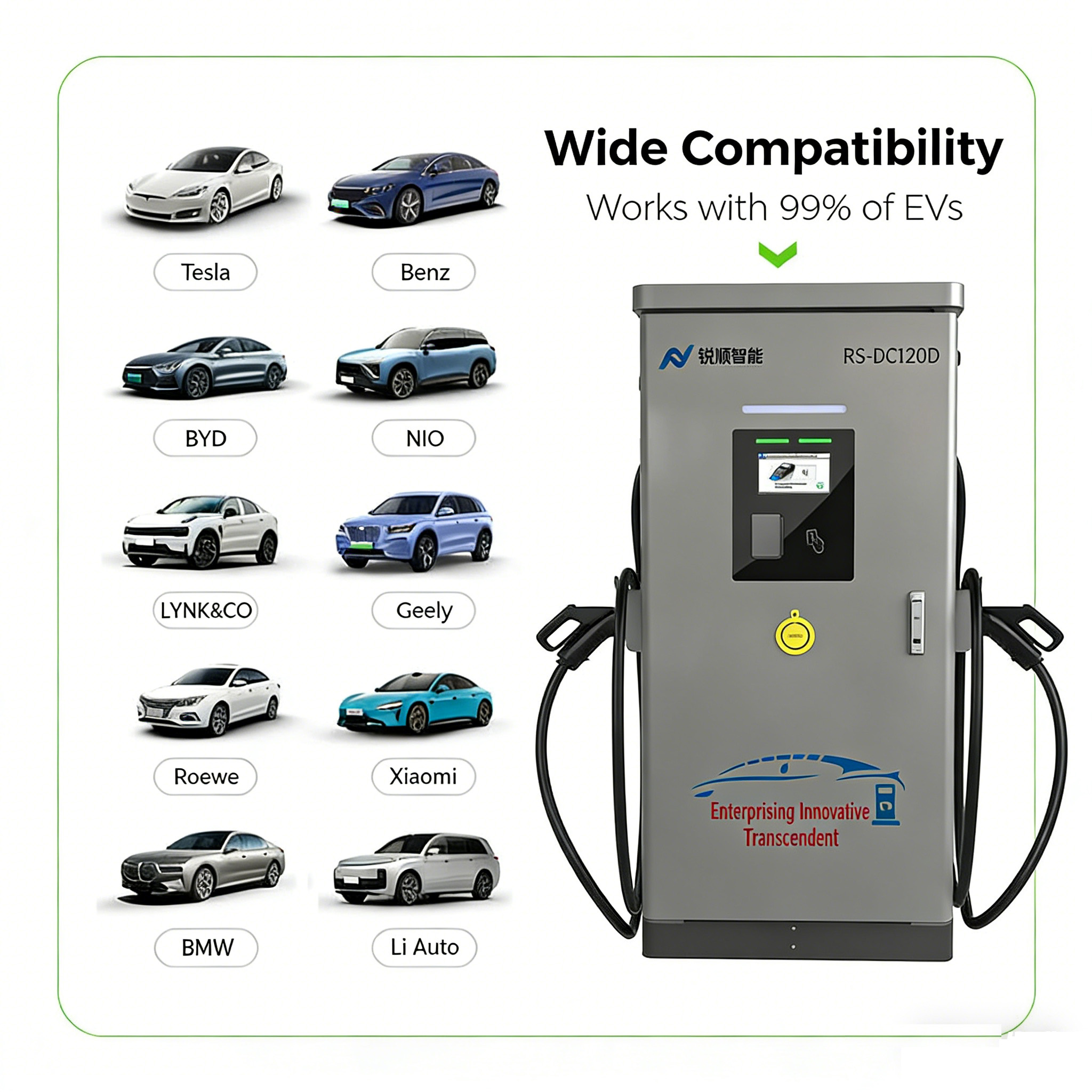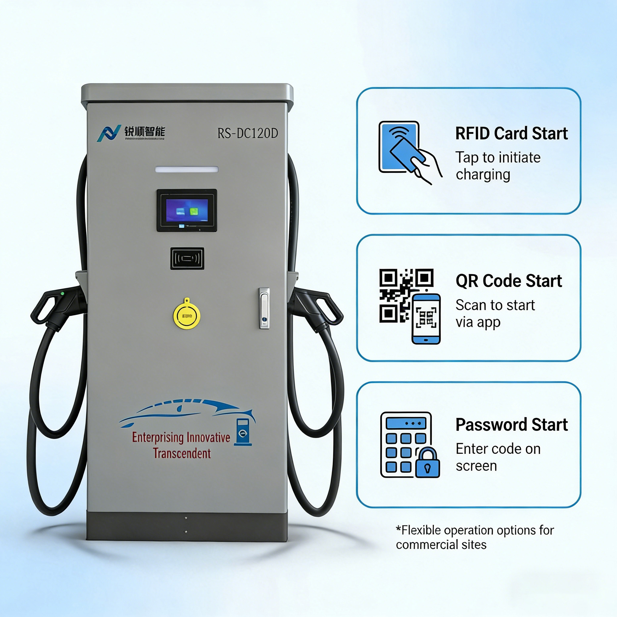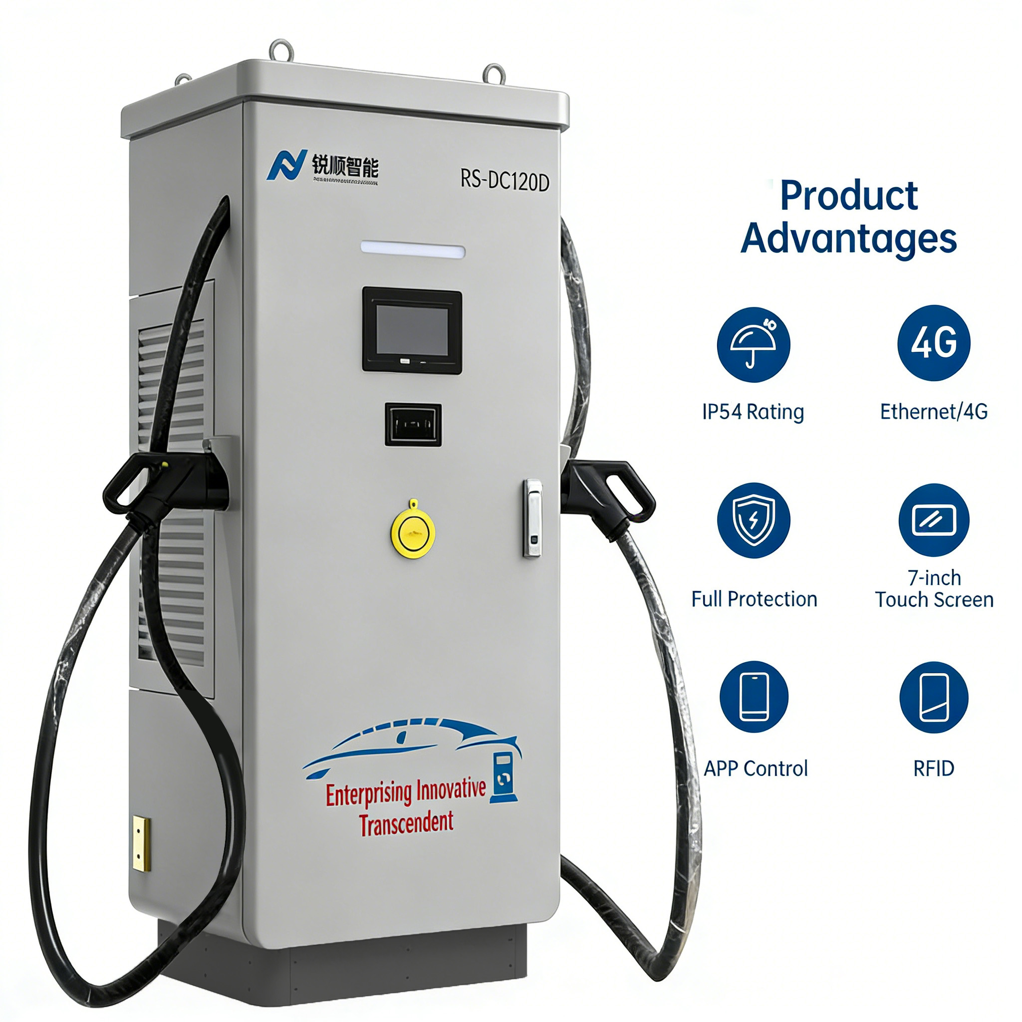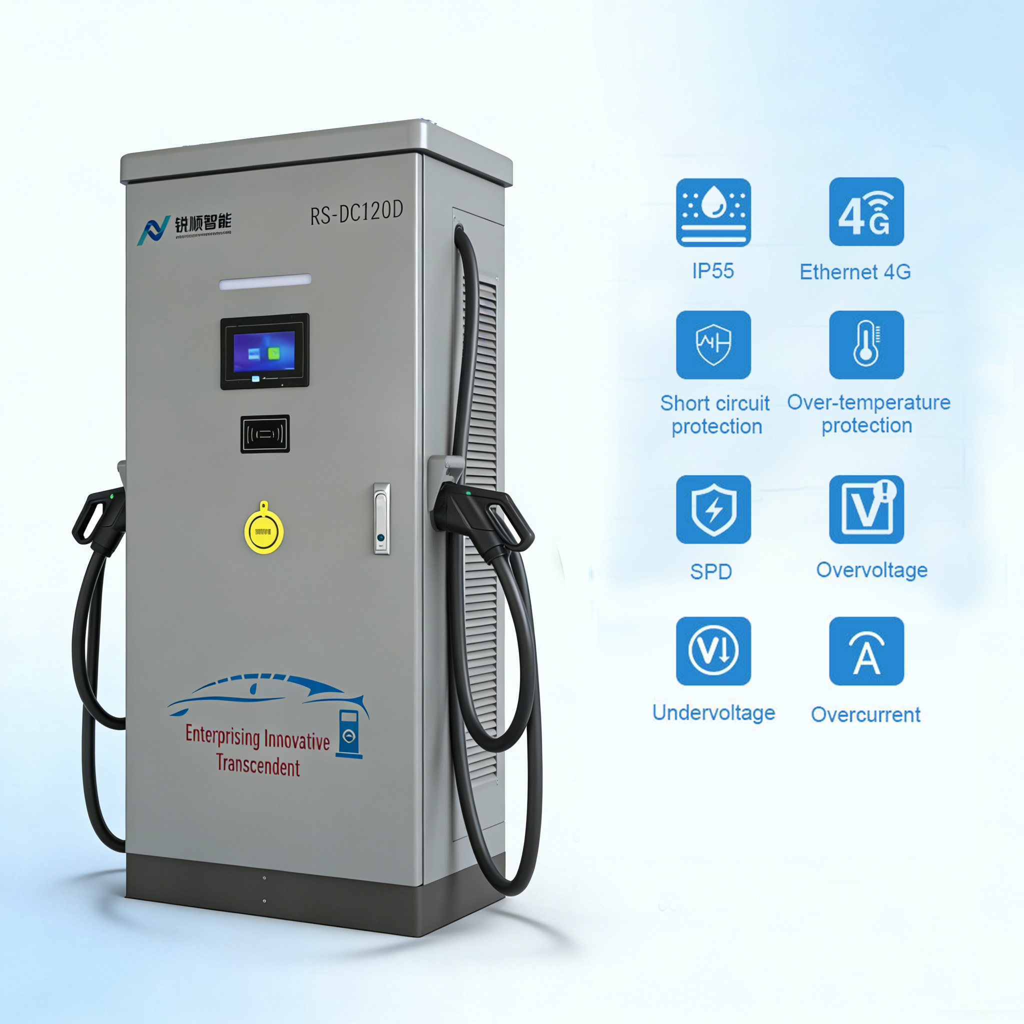 Perfect for highway charging, eBusdepots, eTruck terminals, EV dealerships, and other commercial settings with seamless EV charging, our 120 kW Dual Gun DC Charging station sets a new standard in fast and seamless EV charging. Level 3 fast charger guarantees safety, intelligence, and connectivity for your EV charging needs.